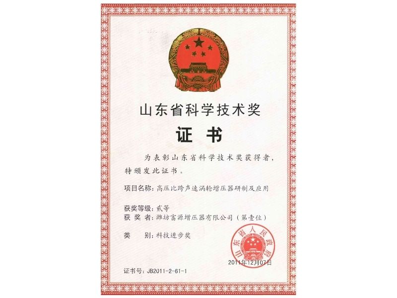 Shandong Science and Technology Award Certificate